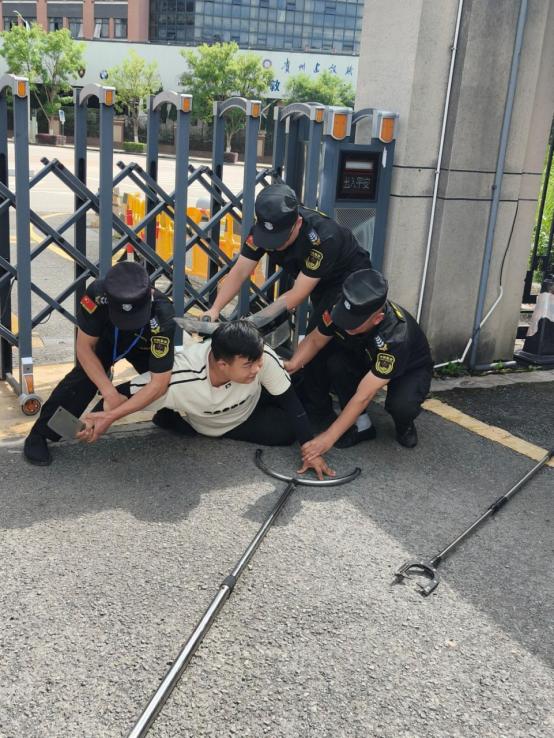 演练模拟一名“歹徒”持械企图闯入校园。安保人员立即启动报警系统,迅速持盾牌、钢叉等防暴器械组成防御队形,果断出击并将其控制。在整个应急处置小组和保安的协同配合下,“歹徒”被快速制服,演练过程响应迅速、配合有序、处置有效。
