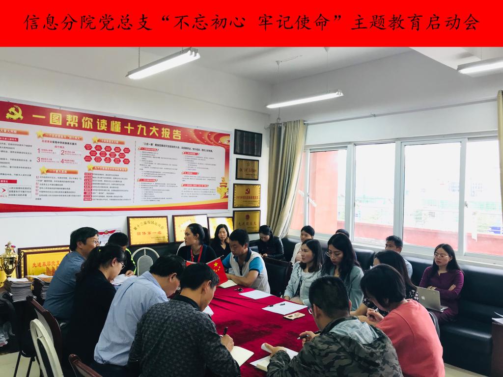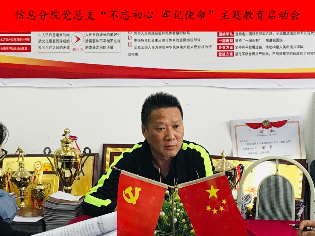 2019年9月18日,按照学院党委统一部署,信息分院召开了“不忘初心 牢记使命”主题教育启动会。会议由李俊书记主持,分管院领导学院党委成员胡宗超同志参会,信息分院院长周叙国同志列席会议。