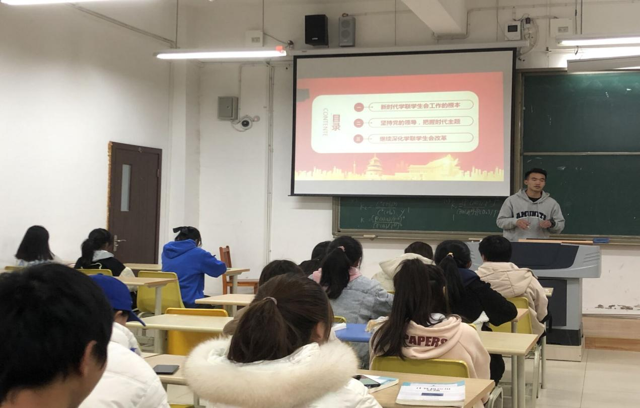 蒲青飘从三个方面做了开场,给同学们讲述了坚持党的领导,新时代学联学生会工作的根本,把握时代主题、继续深化学联学生会改革等内容,并指出了成员们近期工作的不足之处。接下来彭红老师以“身边榜样的力量”为题,给我们分享了两个发生在我们身边的“励志故事”,“故事”中的两个主人公是化工系18级和信息系18级的学姐,讲述了她们珍惜大学时光,努力学习、积极进步、励志成才的事迹,并鼓励大家向两位学姐学习,成为“追逐梦想”的懈奋斗者。同时,彭红老师也再次强调,学生会是为同学服务的窗口,是老师与同学交流的纽带,学生会的成员要勇于担当,积极工作、乐于奉献。