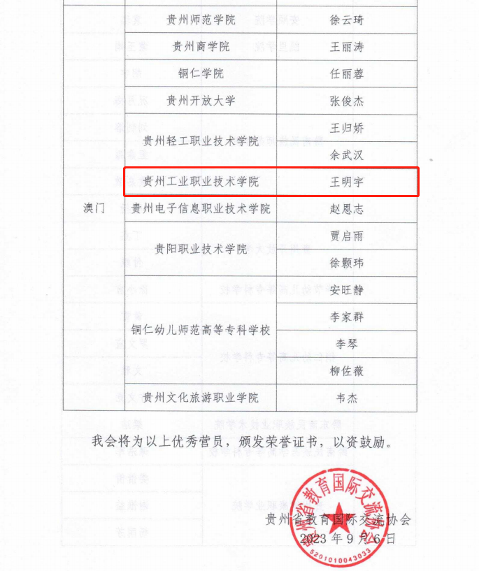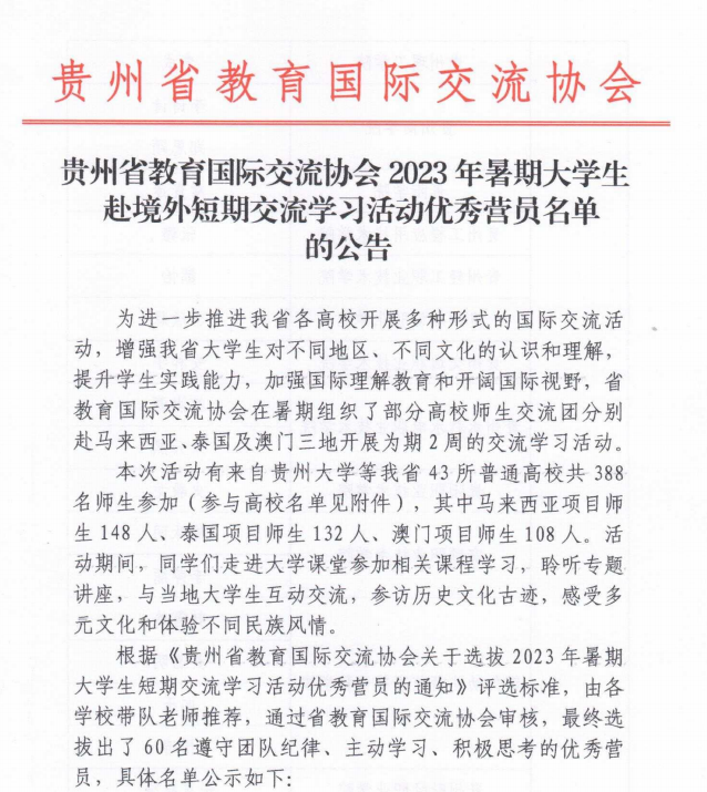 为落实省委、省政府、省教育厅贵澳深度合作工作要求,进一步加强贵澳两地学生交流,拓宽学生眼界和思路,贵州省教育国际交流协会联合澳门中华创新科技发展促进会开展大学生赴澳门研修活动。在省教育厅、省教育国际交流协会的支持下,我院2名优秀学生入选此次活动,赴澳圆满完成研修课程,并有1名学生获得“贵州省教育国际交流协会2023年暑期大学生赴境外短期交流学习活动优秀营员”称号。
