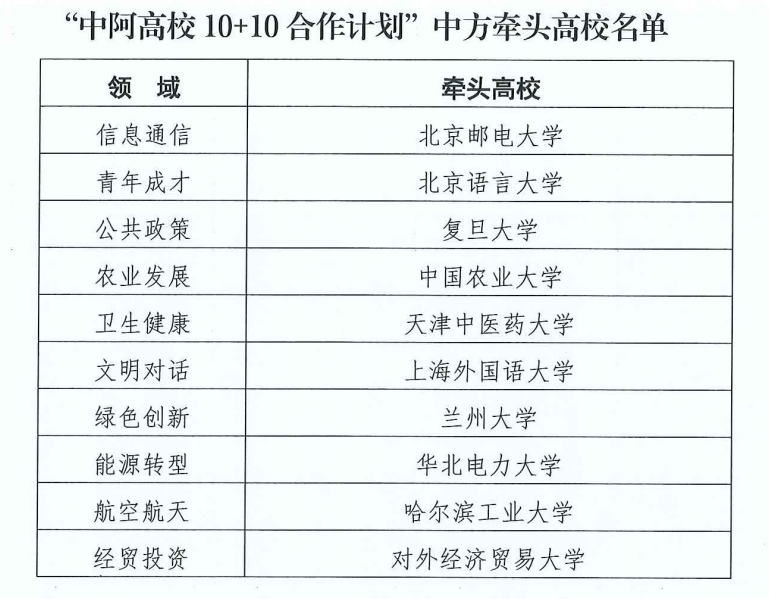 “中阿高校10+10合作计划”是教育部为落实习近平主席在首届中国-阿拉伯国家峰会上提出的中阿务实合作“八大共同行动”之“青年成才共同行动”而设立的交流机制,推动中阿高等教育共同发展,聚焦信息通信、青年成才等十个领域,建立十个高校合作集群,实施开展合作计划。