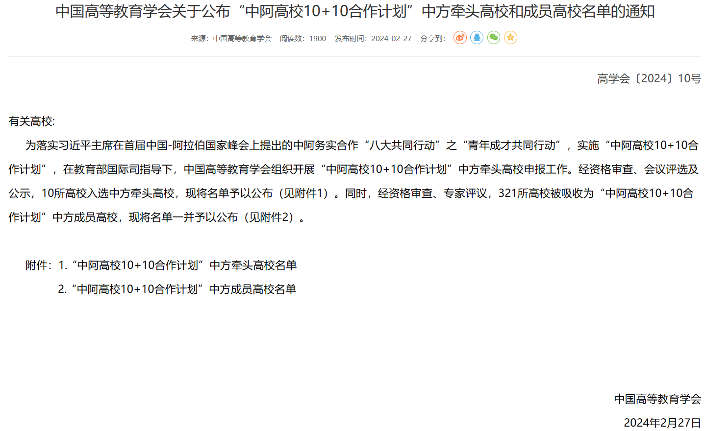 近日,我院入选成为“中阿高校10+10合作计划”中“青年成才”领域的中方成员,标志着我院在推动中阿教育交流与合作方面获得更加广阔的平台。