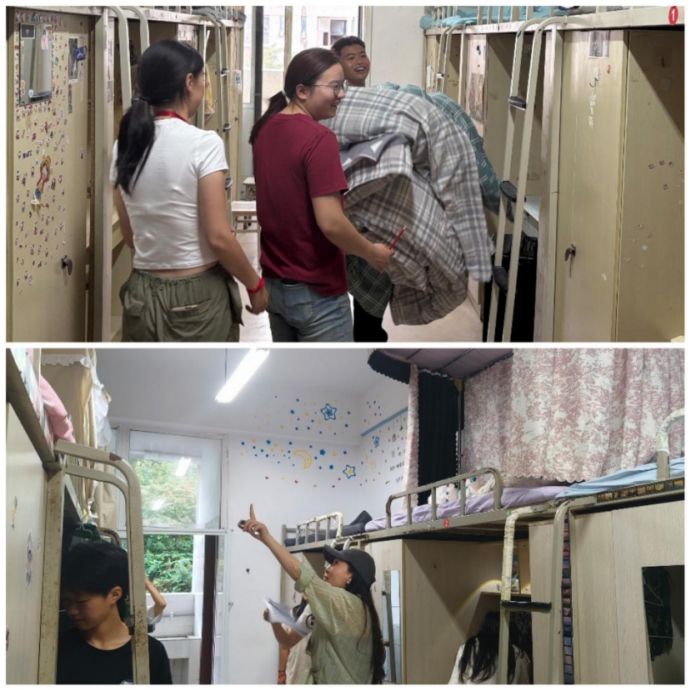 迎新报到结束后,化环系党总支副书记陶希芹带领学生党支部书记董平江、团总支负责人冉东阳、全体新生辅导员及学生会副主席吴孟玲、刘如婷同学组成慰问小组,深入新生寝室开展走访慰问活动,细致查看学子住宿环境,与新生面对面交流,为初入校园的同学们送上温暖与指引。