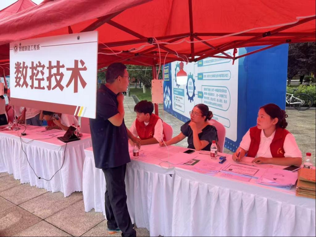 清晨7时许,智能制造工程系的迎新点位已布置就绪。红色的“智能制造工程系”指示牌在场中格外醒目,点位内不仅设有新生报到区、资料领取区、咨询服务区,还特别增设了“智能科技体验角”——老师们现场展示了3D 打印小型模型、智能机械臂操作演示。