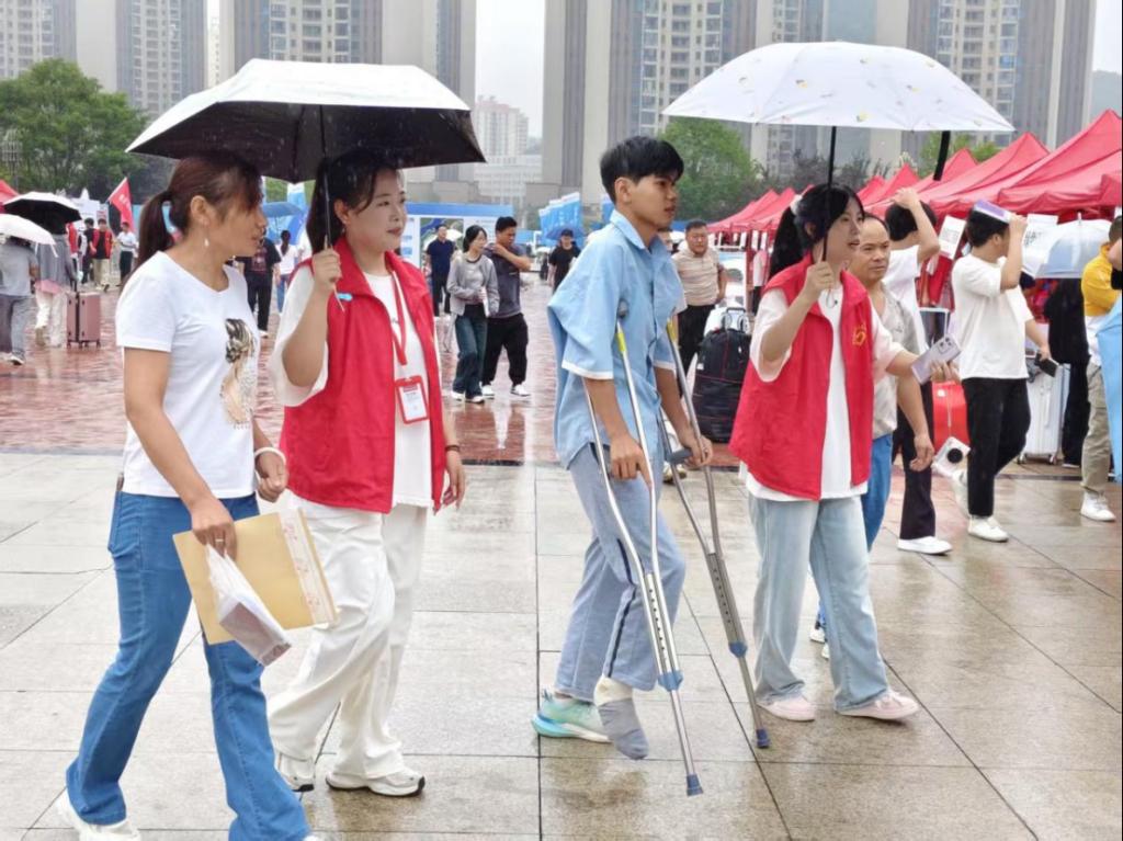 志愿者们更是迎新现场的“暖心担当”。在校园门口、报到点、宿舍区之间来回穿梭,帮新生搬运行李、指引路线、协助办理手续,雨水打湿了衣服却丝毫没有影响服务的热情。刚到上午10点,志愿者们就注意到,校门口有位拄着拐杖的新生正艰难地提着行李箱,雨水顺着伞檐滴落在他的裤脚上。两人立刻快步上前,一人接过行李箱,一人则小心翼翼地给新同学撑伞,得知新同学是因为受伤而行动不便后,两人还提前联系报到处的志愿者,报到时,志愿者们主动帮助新同学填写信息、领取资料;办理完手续后,考虑到宿舍楼层有台阶,志愿者们直接背起新同学的行李,一起护送他到宿舍。到宿舍后,又帮新同学铺好床褥、整理生活用品,还特意把常用物品放在他方便拿取的位置。