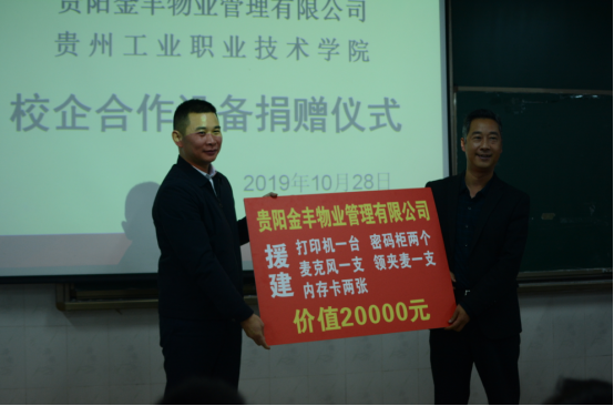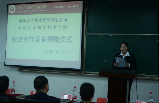 2019年10月28日,星空web版登录入口与贵阳金丰物业管理有限公司举行校企合作设备捐赠仪式,学院党委委员、副院长梅松老师,贵阳金丰物业管理有限公司执行董事杨彪先生一行,经管分院领导班子及教育教学团队成员,物业管理专业学生代表等出席本次捐赠仪式。仪式由分院副院长方维老师主持。