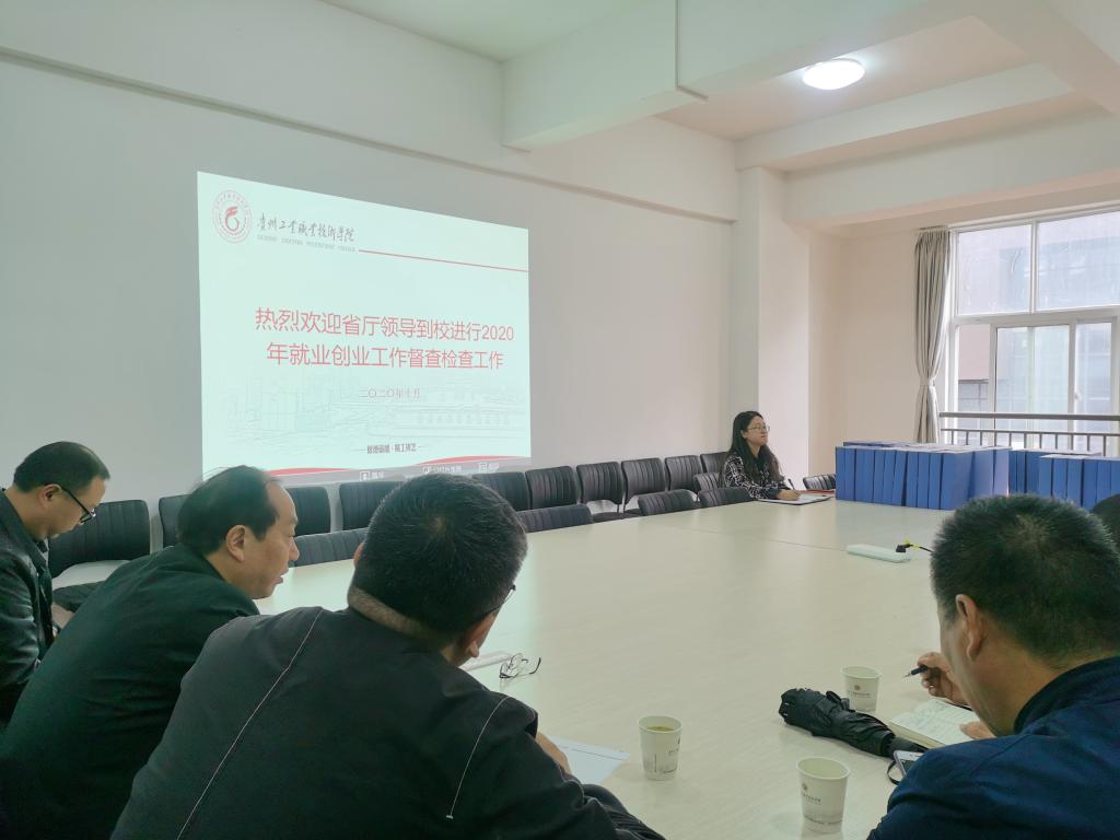 2020年10月14日早,贵阳市大中专毕业生就业指导中心主任黄建军、贵阳学院招生科科长衡朝峻、六盘水师范学院骆波澜一行代表贵州省教育厅,到我校对2020届毕业生就业创业工作进行督查检查,学院党委委员、副院长梅松、各系部总支书记及17级辅导员代表参加汇报、总结会议,招生就业指导办公室主任陈怡主持会议。