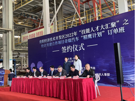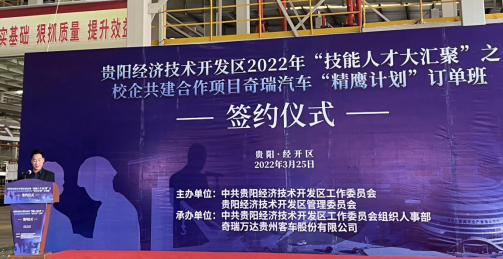 为深入贯彻落实国务院办公厅《关于支持贵州在新时代西部大开发上闯新路的意见》(国发【2022】2号)文件要求,推动职业教育高质量发展,围绕四新主攻四化,全面助推“技能贵州”建设,3月25日下午,由中共贵阳经济技术开发区工作委员会、贵阳经济技术开发区管理委员会主办的2022年“技能人才大汇聚”之校企共建合作项目奇瑞汽车“精鹰计划”订单班签约仪式在奇瑞万达贵州客车股份有限公司总装车间隆重举行。奇瑞万达公司与我校等8所达成订单班合作意向,经开区10 家优质工业企业进行现场见证签约,校企双方就校企共建合作项目进行面对面交流。
