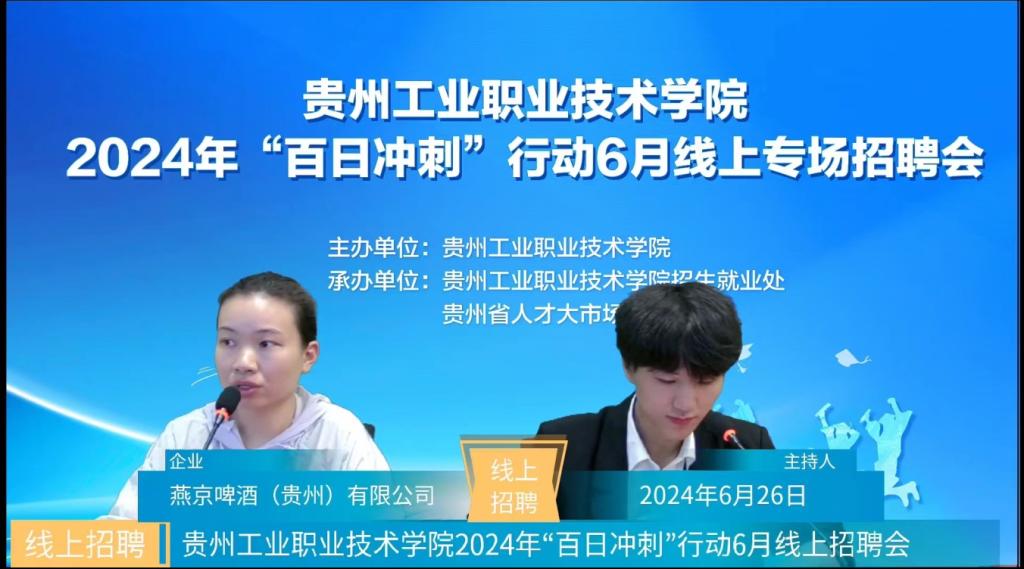 充分利用直播平台,将就业供需与互联网紧密结合,本次招聘根据毕业生特点和企业岗位需求,择优邀请了燕京啤酒(贵州)有限公司、厦门三安光电有限公司、贵州趣露食品有限公司、贵州乾威明科技有限公司、贵州劲嘉新型包装材料有限公司、贵州菁瑞健身管理有限公司、贵州海大装饰设计有限公司、贵州何家公馆醉美生活网络科技有限公司、贵州衡毅烧坊酒业集团有限公司、安顺云鹤装饰有限公司共10家企业走进直播间,为学生提供项目经理、技术督导、文员岗、设备管培生、全自动设备技术员、运维人员等40个职位,需求人数达227人,直播吸引到8915人次在线观看。