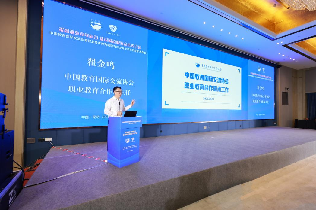 2025年8月6日至7日,学院应邀赴兰州、昆明两地,先后参加由南京工业职业技术大学承办的2025年“中文+职业技能”教育发展研讨会和中国教育国际交流协会职业技术教育国际交流分会2025年度学术年会。中国教育国际交流协会职业技术教育国际交流分会(以下简称“职教分会”)2025年度学术年会以“提升海外办学能力,建设周边职教合作先行区”为主题,由职教分会主办。中国教育国际交流协会副会长、秘书长杨军,教育部职业教育与成人教育司综合改革处一级调研员李红东,云南省教育厅二级巡视员雷韬,中国教育国际交流协会职业教育合作部主任翟金鸣,中国教育国际交流协会职教分会理事长、南京工业职业技术大学党委书记谢永华,云南机电职业技术学院党委书记赵伟、校长沈韬出席会议。