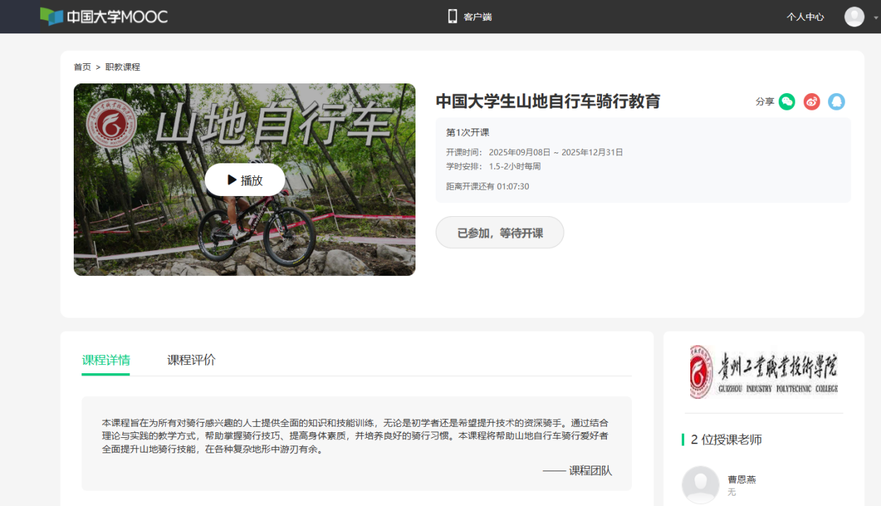 9月8日,由我院教师曹恩燕首创开设的《中国大学生山地自行车骑行教育》线上课程在中国大学MOOC、北京大学华文慕课上同时开课。本课程是在全国高校山地自行车人才培养上的创新举措,也是我院首次上线中国大学MOOC。