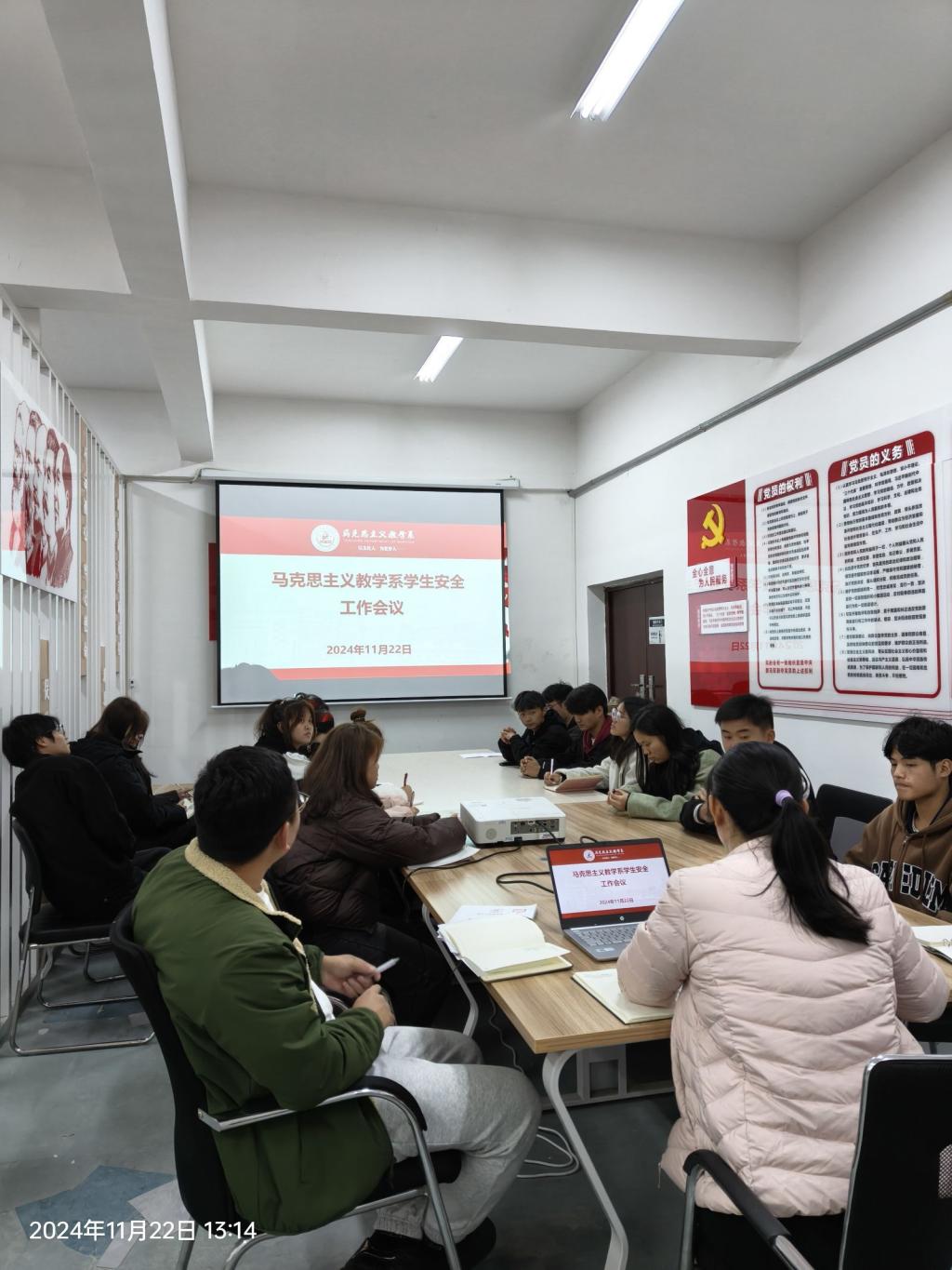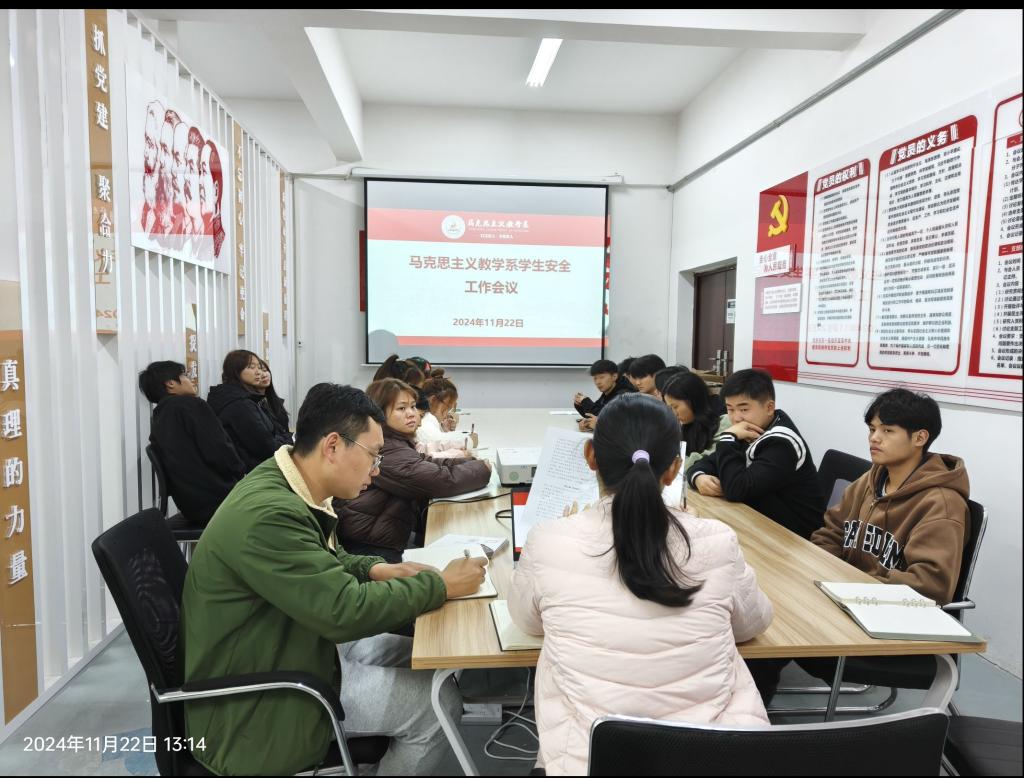 11月22日中午,马克思主义教学系召开学生安全教育管理工作会议。会议由马克思主义教学系团总支书记罗兴主持,班级辅导员、全体学生会干部、班干部参加会议。罗兴书记就相关工作进行提醒。一是临近期末,诚信应考,希望同学们严守纪律规矩,筑牢底线意识,严肃考风考纪;二是认真严肃对待宿舍归寝工作,宿舍长、学生会干部紧密团结,强化责任意识,积极发挥桥梁与纽带作用,启用归寝钉钉打卡,确保按时归寝;三是安全教育,包括宿舍安全、反诈防诈、网络文明教育、饮食安全、心理健康问题等;四是学生干部廉洁工作,要求全体学生干部本着为同学服务的原则,廉洁自律,做好本职工作。