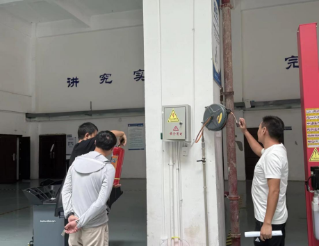 本次安全检查重点紧紧围绕汽车工程系所辖实训室的设备用电安全、消防设施完好情况及实训设备安全运行状态等关键环节开展检查。具体包括:大功率设备接线是否规范、接地保护是否可靠;举升机、轮胎拆装等大型设备的安全运行状态;新能源实训区域的绝缘工具、警示标识是否完备;消防通道是否畅通,灭火器、应急灯等设施是否按规配置且状态良好等方面。