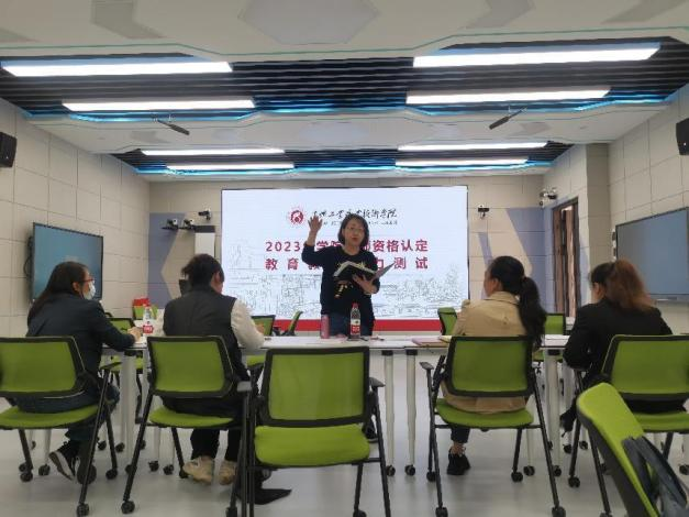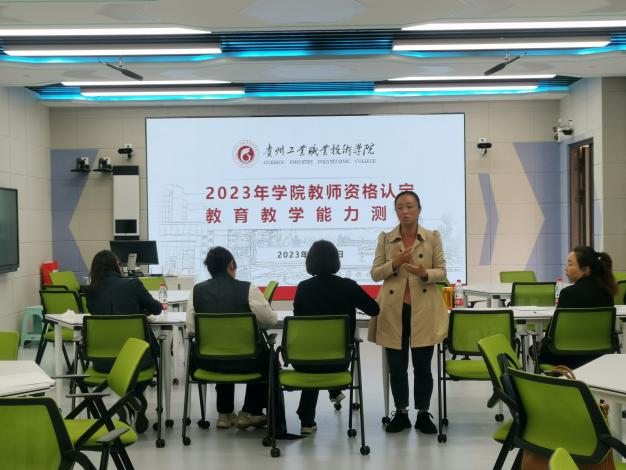 根据《省教育厅关于开展2023年高等教师资格认定工作的通知》及《关于2023年学院教师资格认定教育教学能力的测试方案》(学院教务处教字﹝2023﹞14号)要求,为符合教育部门的规定,深入贯彻党中央、国务院关于职业教育改革的决策部署,引领广大教师落实立德树人根本任务,转变教育教学理念,强化课程思政,更新教学内容,改进教学评价,以测促教,以评促学,提升教师教育教学能力,不断提升人才培养质量,2023年5月15日上午,教务处会同人事处在清镇校区悦知楼404智慧教室组织开展2023年教师资格认定教育教学能力测试。按申报教师的学科分类,本次测试邀请机电系主任李莉娅、基础部主任唐敏、化工系副主任朱红、工管系副主任方维及组织人事处处长刘林5名专家作为评委,对 11名申请高校教师资格证的教师进行教育教学能力测试。