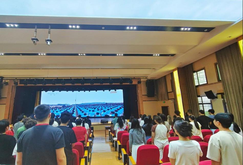 当直播进行到升旗仪式时,国歌奏响,全体师生迅速起立,目光坚定地注视着屏幕上的五星红旗,齐声高唱国歌,歌声激昂,饱含着爱国的赤诚之心。观看现场,师生们沉浸在庄严而激昂的氛围中,目光始终紧紧追随着屏幕上的画面。受阅方队的整齐程度、装备的先进水平,无不让他们深感震撼,爱国之情在心底熊熊燃烧。