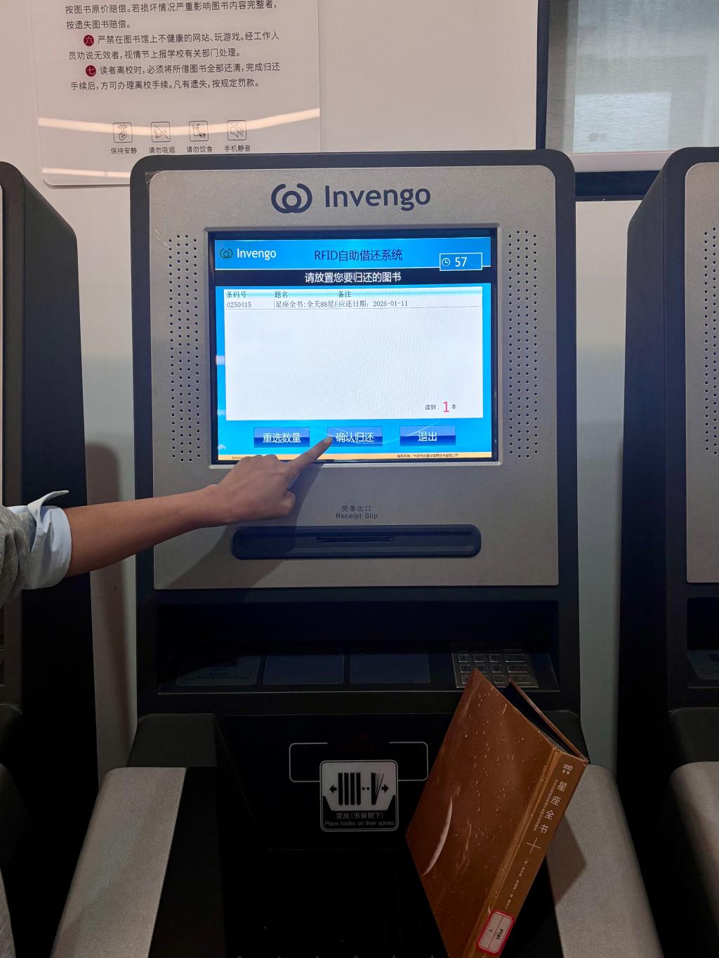 三、将需要归还的图书放置在图书识别区,待识别图书名称后,点击“确认归还”即可。