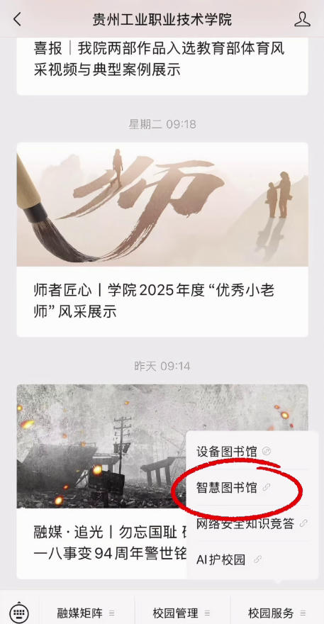 一、在学院公众号右下角选择“智慧图书馆”
