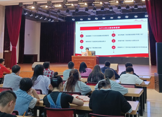 宣讲会上,尹丽副书记围绕省第十三次党代会精神,从深刻把握大会的重大意义,深刻把握衷心拥护“两个确立”、忠诚践行“两个维护”,深刻把握过去五年的历史成绩和经验启事,深刻把握我省今后五年工作的总体要求、主战略、主定位和奋斗目标,深刻把握今后五年贵州高质量发展的重点任务,深刻把握实现未来奋斗的政治保证,深刻把握学习贯彻落实精神提出的要求等七个方面对大会精神进行了深入解读。希望全体学生骨干、团员、团干要深入学习宣传贯彻省第十三次党代会精神,在学思践悟中感悟高质量发展的鲜明主题,切实用省第十三次党代会精神指导自身学习发展。并对全体与会学生骨干提出三点要求:一是要提高政治站位,不断加深对省第十三次党代会精神的理解,自觉践行“忠诚坚定、阳光自信、身手敏捷、体魄健康、团结协作、血性担当”的学子品格;二是要加强理论学习,深入学习习近平新时代中国特色社会主义思想和习近平总书记在庆祝中国共产主义青年团成立100周年大会上的重要讲话精神,做到内化于心,外化于行;三是要始终高举伟大旗帜、牢记领袖嘱托,真正把衷心拥护“两个确立”、忠诚践行“两个维护”,融进血脉里,坚定不移的向党组织靠拢。