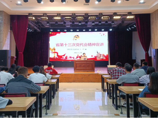 为深入学习领会省第十三次党代会精神,2022年5月30日17:00,学院团委副书记尹丽以“学习省第十三次党代会精神”为主题,在学院双创中心大礼堂为院学生会50余名青年学生骨干作了专题宣讲。