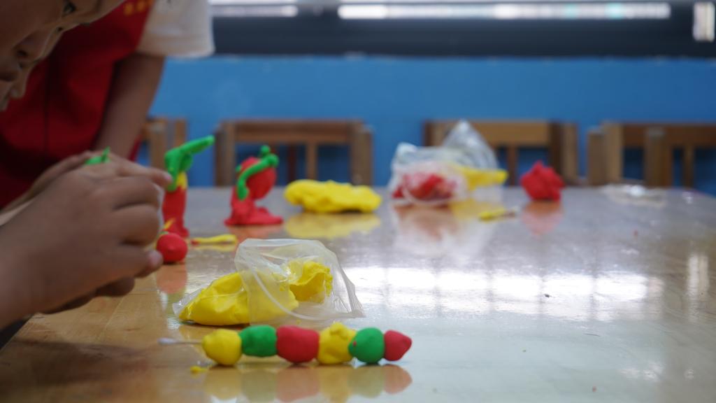图为清镇市特殊教育培智一年级学生粘土作画过程及成果展示