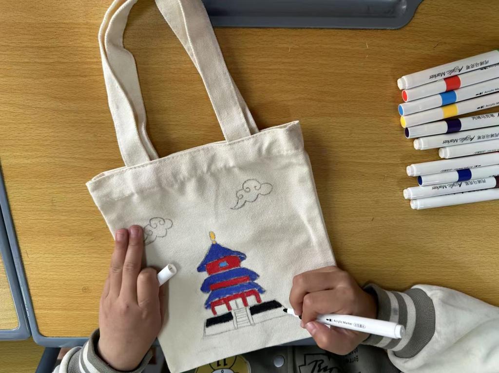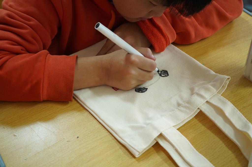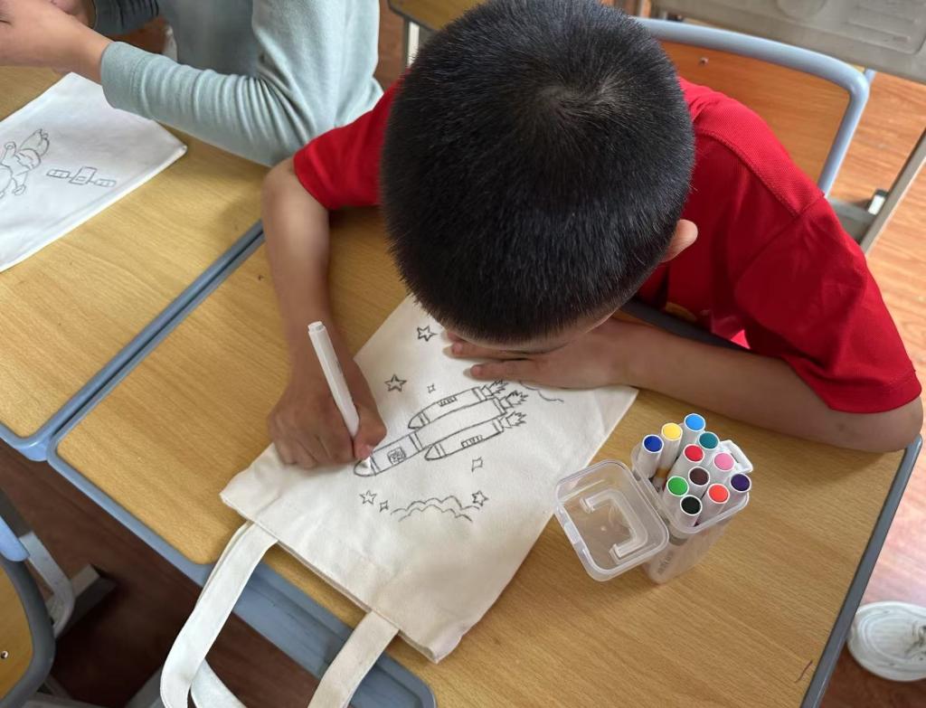 为了将中华优秀传统文化植根于儿童心中,志愿服务实践团队来到清镇市特殊教育培智五年级,以“色彩表达爱国情怀”为主题,开启了一场“视觉-触觉-情感”三重浸润的爱国教育实践。通过着色印制有中国标识、中国建筑、中国科技的帆布包,与特殊教育共建思想政治教育课堂,将爱国教育融入特殊教育当中,有效培养和提升同学们的爱国情怀,帮助特殊儿童建立对国家文化的具象认知与情感联结。