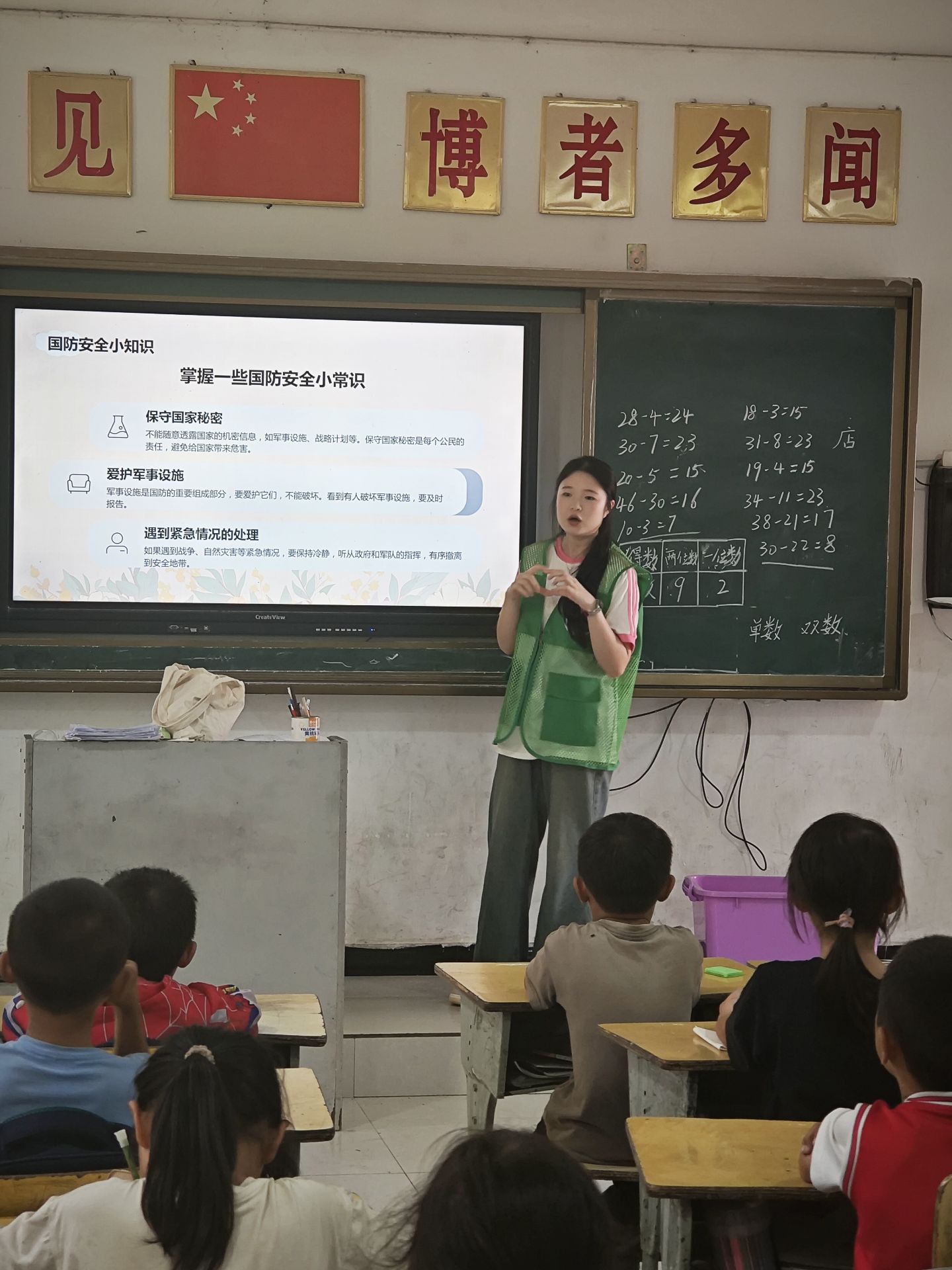 实践团主动对接九溪村小学,打造“国防教育 + 意识形态安全”融合课堂,将国家安全知识转化为生动鲜活的思政教材。队员们借助短视频、安全绘本等载体,通过情景模拟、互动问答等形式,向孩子们普及国家安全基本常识,阐释 “国家安则小家宁”的深刻内涵。课堂上,学生们积极参与、踊跃发言,纷纷表示立志成为 “国家安全小卫士”。此次活动不仅补齐了乡村小学系统性安全思政教育的短板,更将国家安全理念根植于青少年心中,为构建家校社协同的安全育人体系夯实基础。