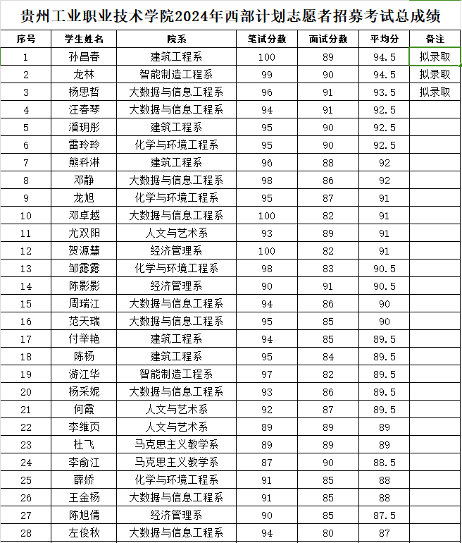 根据贵州省大学生志愿服务西部计划项目管理办公室《关于做好2024年贵州省大学生志愿服务西部计划志愿者招募、选拔、派遣的通知》,校团委及时将相关通知发放到各系部团总支,并通过校园广播、微信公众号等平台广泛进行宣传动员。经过网上报名,学院团委审核,5月29日,对符合条件的同学进行了笔试及面试;现将综合成绩公布如下: