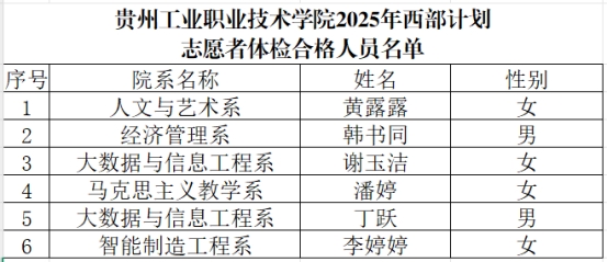 根据共青团贵州省委贵州省教育厅贵州省财政厅贵州省人力资源和社会保障厅《关于做好2025-2026年度贵州省大学生志愿服务西部计划实施工作的通知》文件精神,我校于2025年5月启动星空web版登录入口2025年大学生志愿服务西部计划招募工作。经公开招募、网上报名、学院推荐、资格复核、笔试面试等相关流程,现将体检合格人员进行公示,具体名单公示如下: